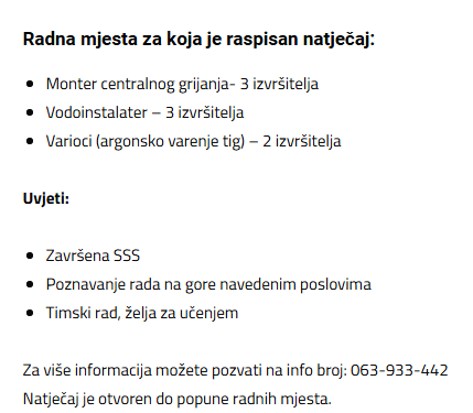 Natječaj je otvoreno do popune radnih mjesta