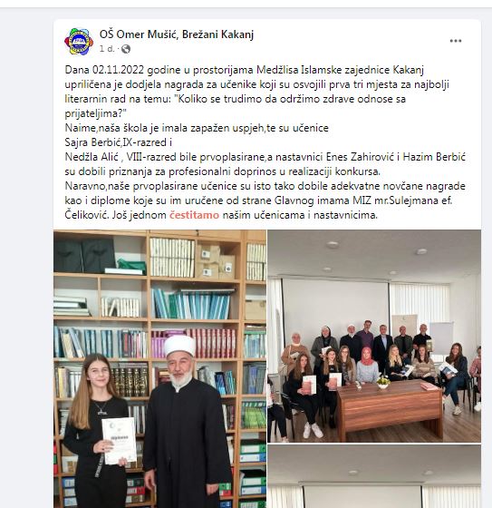 Naravno, prvoplasirane učenice su isto tako dobile adekvatne novčane nagrade kao i diplome koje su im uručene od strane Glavnog imama MIZ mr.Sulejmana ef. Čeliković. Iz škole, Osnovne škole “Omer Mušić” još jednom su čestitali svojim učenicama i nastavnicima te svoju objavu javno objavili na svojoj fb stranici škole…