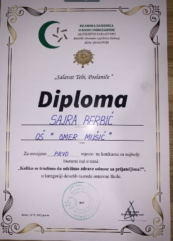 Naime, njena škola, Osnovna škola “Omer Mušić” je imala zapažen uspjeh, te su učenice Sajra Berbić, IX-razred i Nedžla Alić , VIII-razred bile prvoplasirane,a nastavnici Enes Zahirović i Hazim Berbić su dobili priznanja za profesionalni doprinos u realizaciji konkursa.