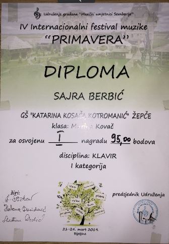 - Internacionalni festival muzike “Primavera” u Bijeljini na kojem sam osvojila prvu nagradu (školska 2018./2019. godina),