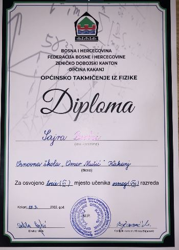 - Općinsko takmičenje iz fizike na kojem sam osvojila treće mjesto, a također sam učestvovala I na Kantonalnom takmičenju (školska 2021./2022. godina),