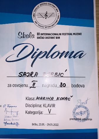 - Internacionalni festival muzike “Skala” u Brčkom na kojem sam osvojila drugu nagradu (školska 2021./2022. godina),