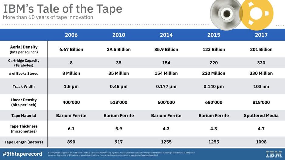 Spomenuti kapacitet jednak je biblioteci koja ima više od 300 miliona knjiga. Gustina pohranjenih podataka iznosi 201 gigabit po kvadratnom inču, a za smještanje je korišten prototip magnetne trake koja ima do 20 puta veću gustinu od standardnih magnetnih traka.