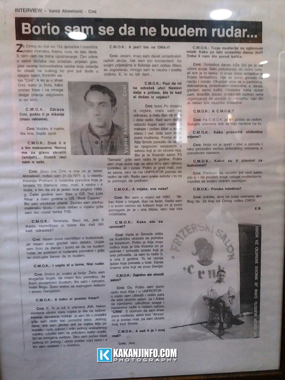 Ovo pišemo jer u narednim redoovima prilažemo jedan primjerak interesantnog intervju-a koji je u svojim početcima za jedan časopis uradio kakanjski frizer VEHID AHMETOVIĆ – CRNI kojeg kao frizera mnogi godinama vole, cijene i poštuju, pa pročitajmo šta je to izjavio CRNI prije nešto više od 20.godina.