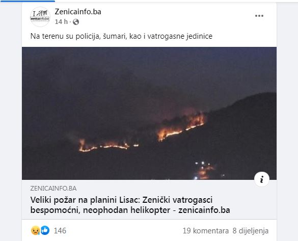 “Trenutno se u nekim dijelovima ne može djelovati, helikopter bi morao izaći. Šumari koji su nadležni za taj sektor su na terenu”, kazali su za jedan portal iz Profesionalne vatrogasne jedinice Zenica.