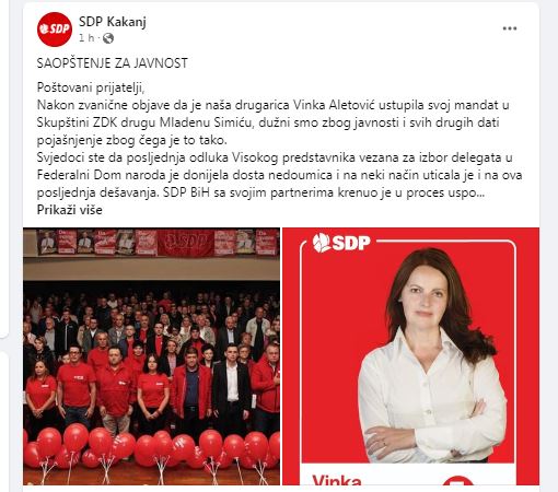 Nakon što je portal Kakanjinfo i još neki mediji objavili vijest da je Vinka Aletović ustupila mandat Mladenu Simiću, oglasio se i SDP Kakanj sa objavom i saopštenjem za javnost u kojoj stoji…