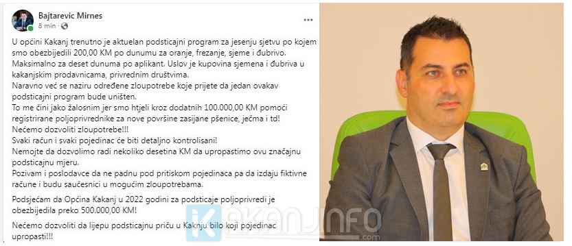 Nakon što je u općini Kakanj objavljen aktuelan podsticajni program za jesenju sjetvu po kojem je obezbijeđeno 200,00 KM po dunumu za oranje, frezanje, sjeme i đubrivo. Maksimalno za deset dunuma po aplikant. Uslov je kupovina sjemena i đubriva u kakanjskim prodavnicama, privrednim društvima. Danas se na svom profilu javno oglasio i načelnik Kaknja Mirnes Bajtarević i reagovao s riječima: