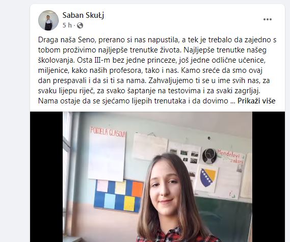 “Draga naša Seno, prerano si nas napustila, a tek je trebalo da zajedno s tobom proživimo najljepše trenutke života. Najljepše trenutke našeg školovanja. Osta III-m bez jedne princeze, još jedne odlične učenice, miljenice, kako naših profesora, tako i nas. Kamo sreće da smo ovaj dan prespavali i da si ti sa nama. Zahvaljujemo ti se u ime svih nas, za svaku lijepu riječ, za svako šaptanje na testovima i za svaki zagrljaj. Nama ostaje da se sjećamo lijepih trenutaka i da dovimo za tebe, ljepotice naša. Sada si na boljem svijetu i mi te molimo da nam čuvaš mjesto u Džennetu jer sa sigurnošću mogu reći da ti to zaslužuješ. Nikada te ova škola, niti ovaj razred neće zaboraviti. Teška će biti godina bez tebe Seno moja, a kako ova, tako i svaka naredna sve dok se i mi ne rastanemo sa ovim nepravednim i prolaznim dunjalukom. Nikada te neće zaboraviti tvoj III-m. Tebi želimo da ti Allah podari vječni rahmet, a tvojoj porodici i nama sabur i strpljenje, jer svako će biće smrt okusiti.