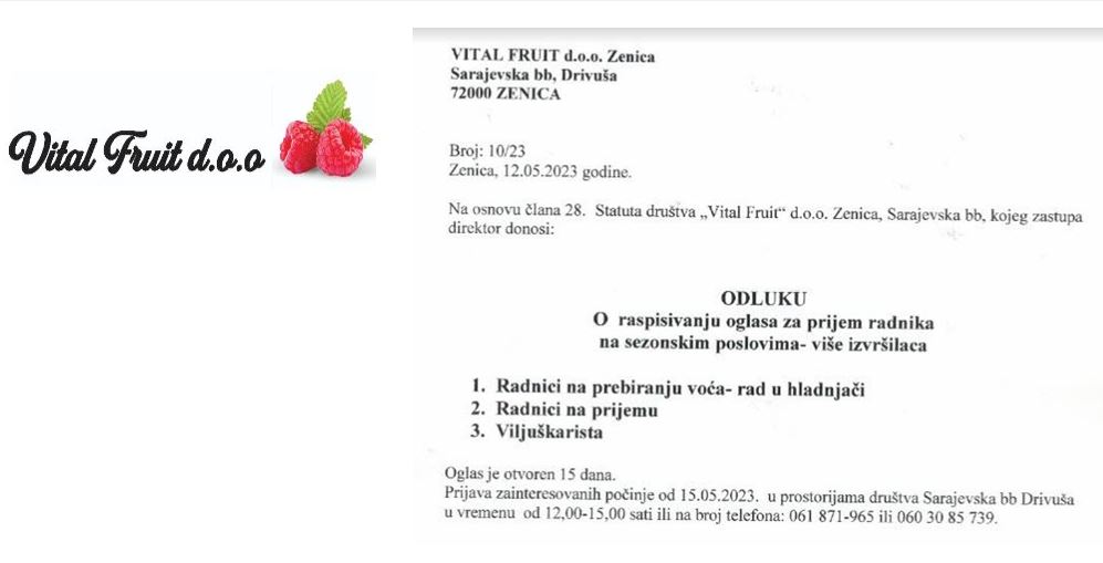 PRIJAVI SE NA – Oglas za posao firme Vital Fruit d.o.o. ![]()
